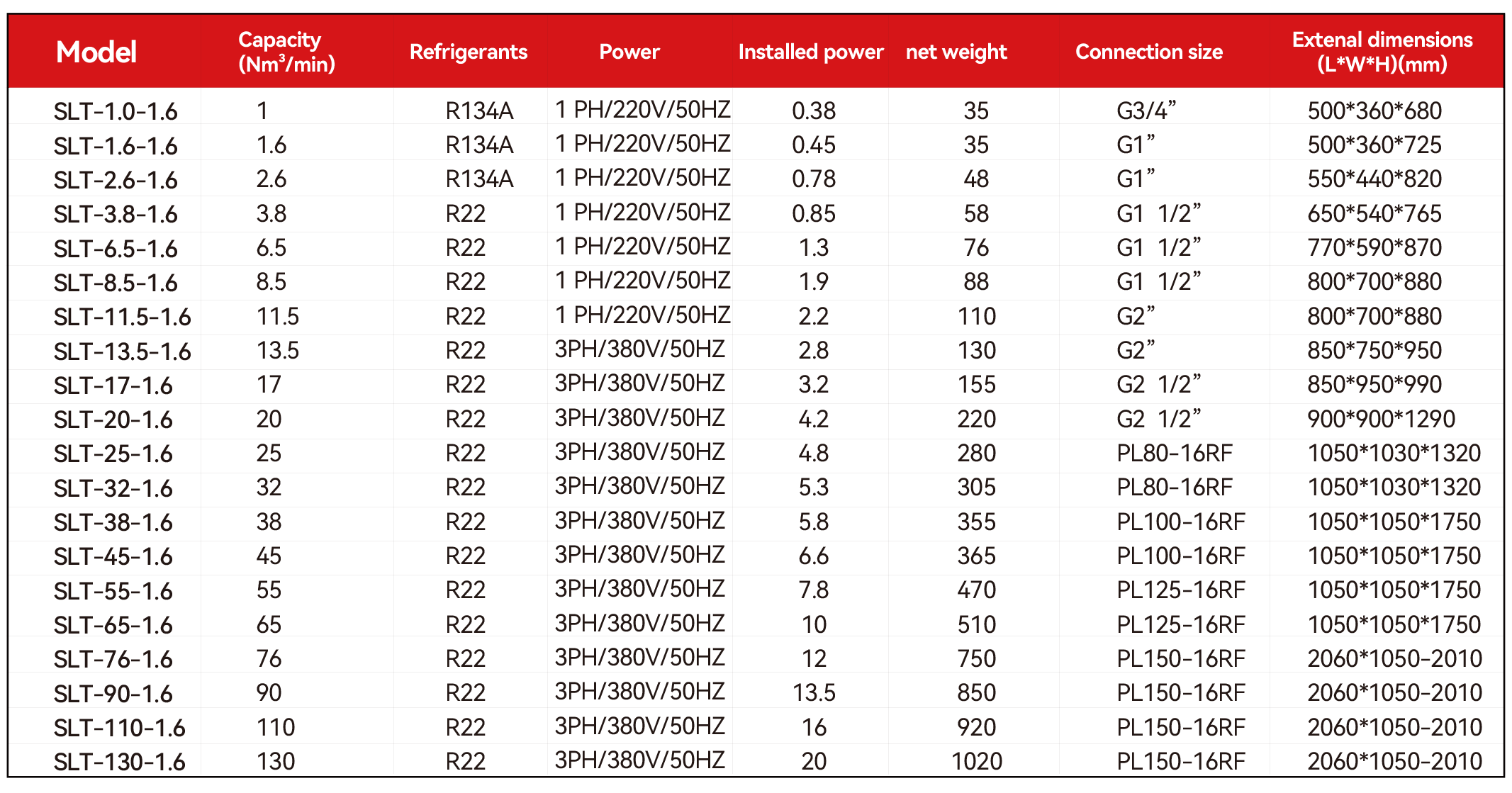 Refrigerated Air Dryer Parameters Table