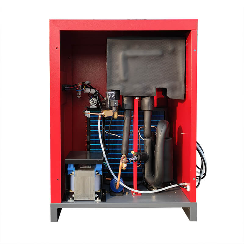 The refrigerated dryer is based on the principle of refrigerated dehumidification, and the compressed air containing a large amount of saturated water vapor is forced to cool down, while keeping the pressure of the compressed air basically unchanged, the temperature of the compressed air is reduced, so that a large amount of water vapor in the compressed air It is in a supersaturated state, and in the saturated state, the water vapor condenses into liquid water droplets, entraining dust, and the steam-water separation device separates the water and dust and discharges them through the automatic drainer, so as to achieve the purpose of freezing and dehumidification.